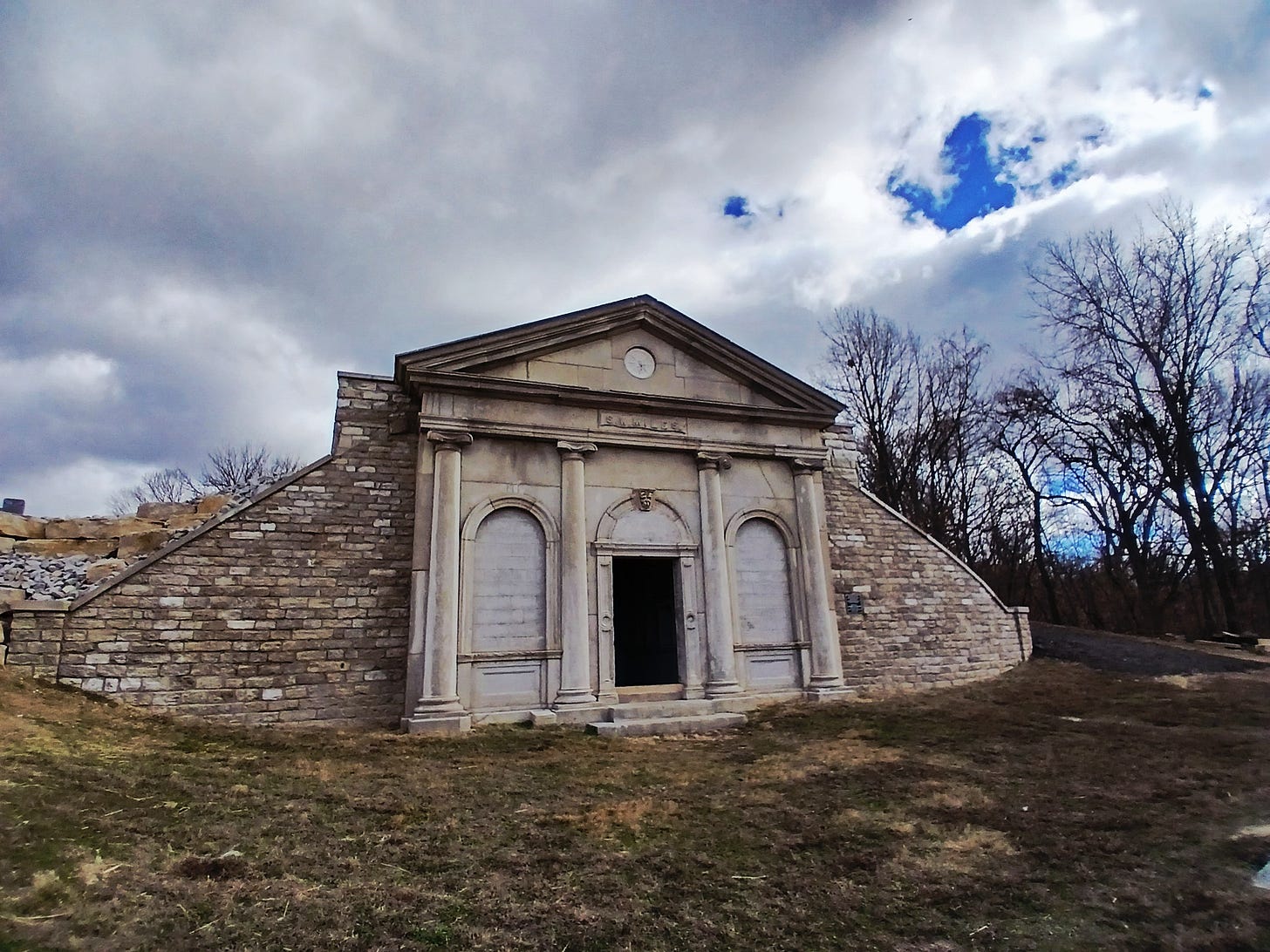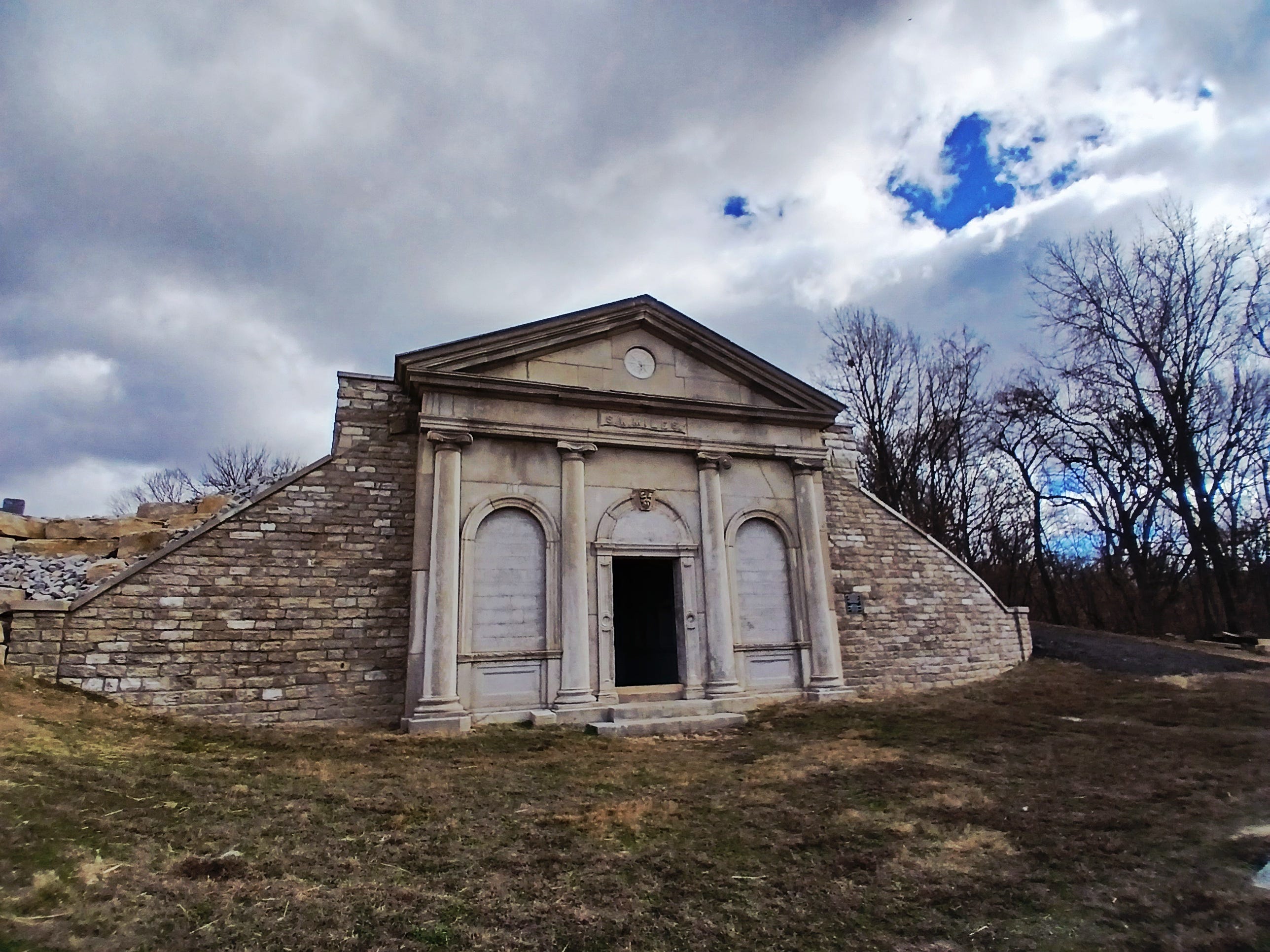 Past America, past the heartbreaking graves of dead children, past the fallen tombs of forgotten soldiers and their wives, past the prairie grasses that grow defiantly above the poisoned soil, is the mausoleum. It was built by businessman Stephen W. Miles in 1859 for his family but now looms empty on a hill. An open doorway topped with a gargoyle invites you to enter.